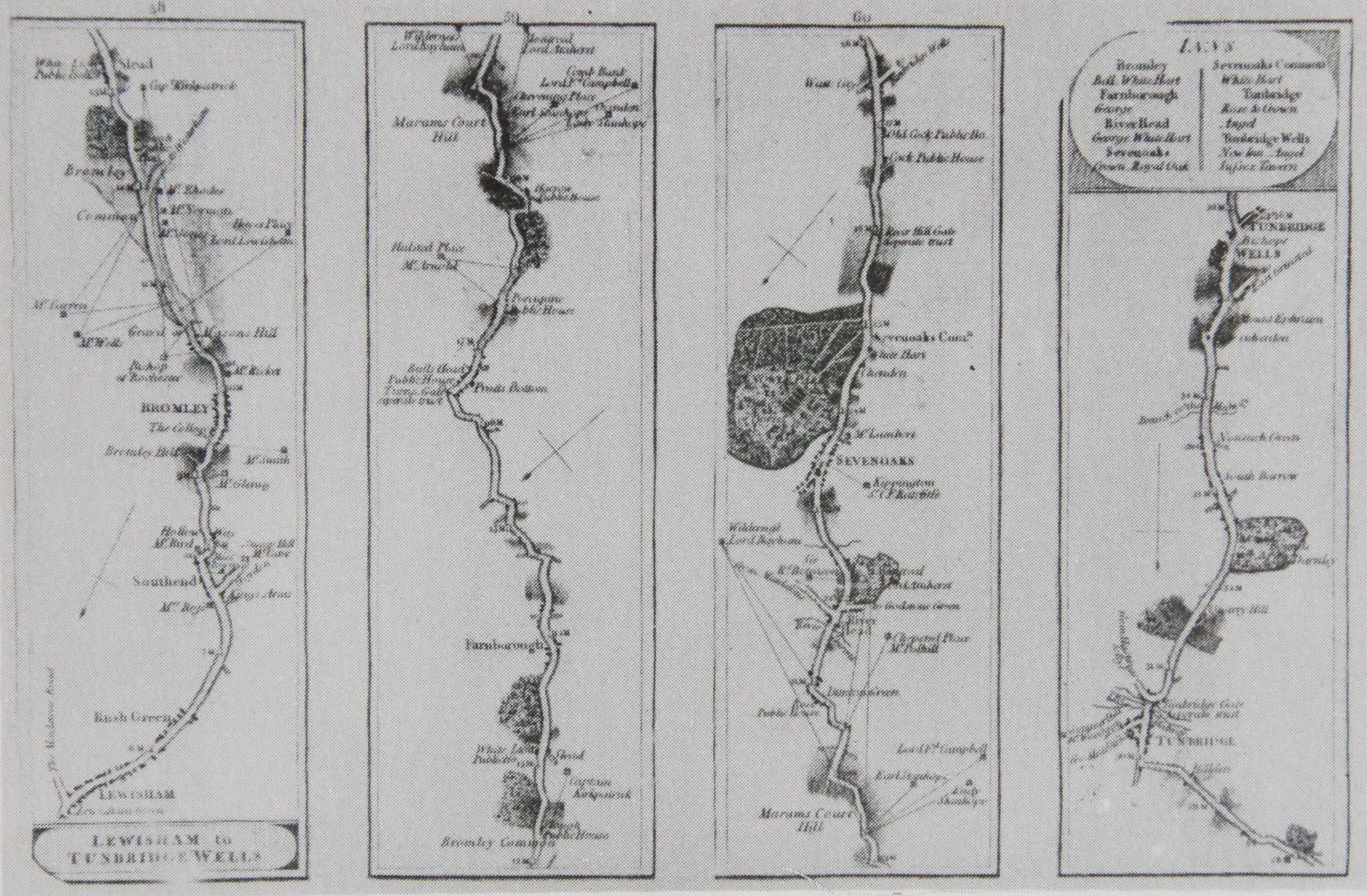 This is an engraving of the original route between Lewisham and Tenterden, although of rather poor quality reproduction. North is at the bottom, and the route is described working south from left to right across the four panels. Farnborough is in the second panel.