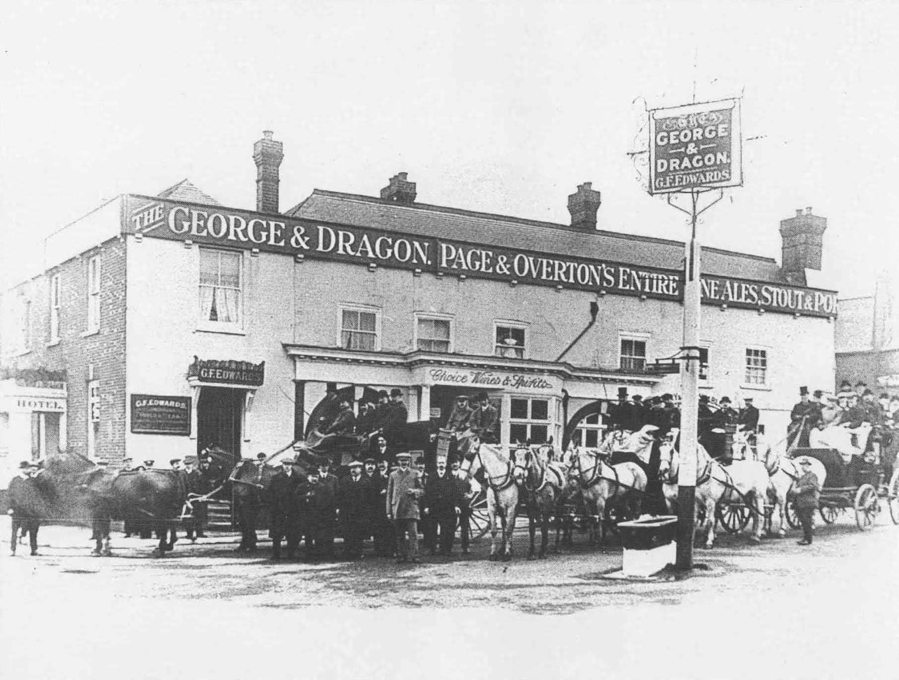 The photos at the top of all pages show:the old George and Dragon Inn that stood in the heart of the village and served travellers using the long distance road for many centuries, and the viaduct on the main line approaching London Bridge soon after opening.