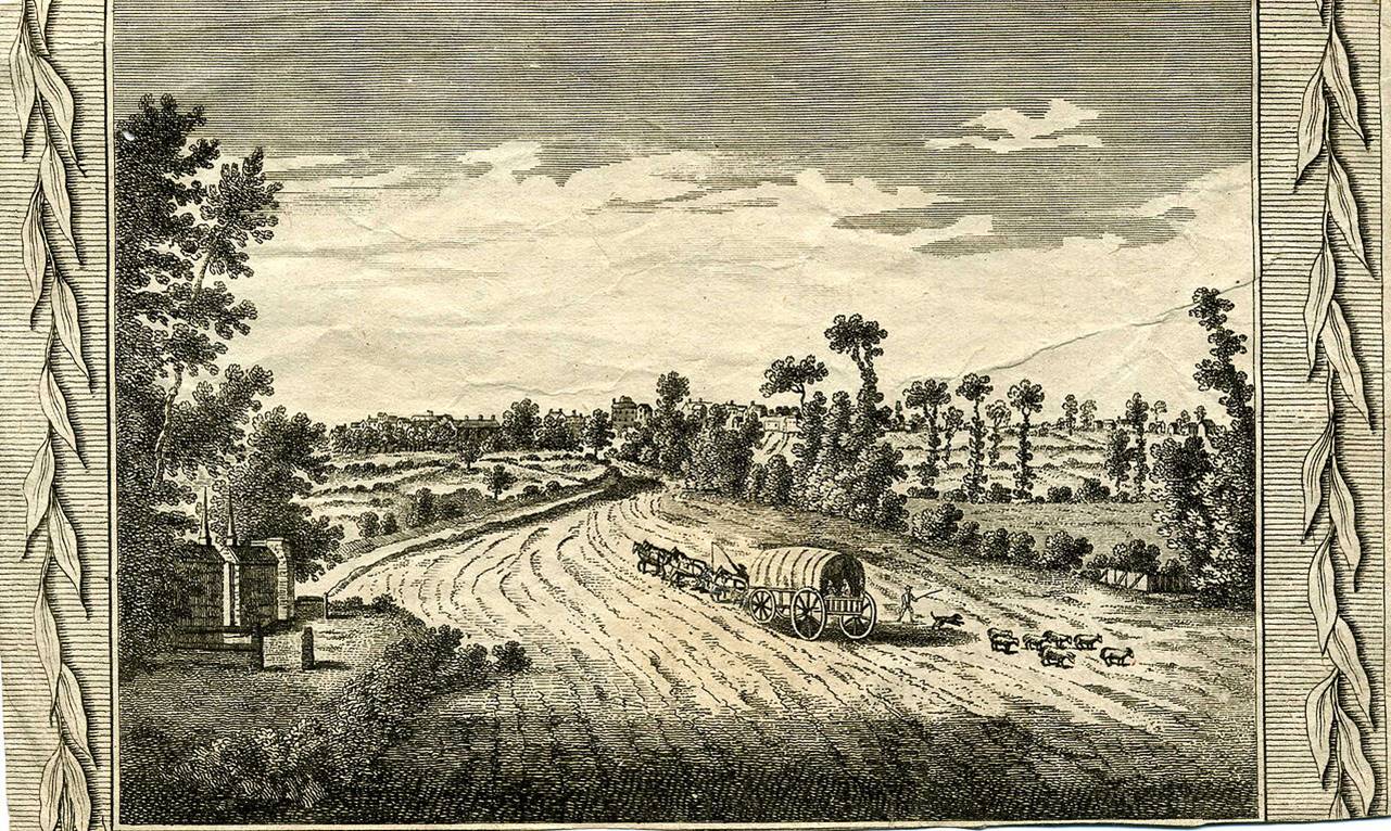 The New Cross Turnpike. numbered 14 and shown in yellow in the map, leads toward Bromley and Farnborough. The painting below is of the toll gate in Deptford at the start of the turnpike route toward Kent.
