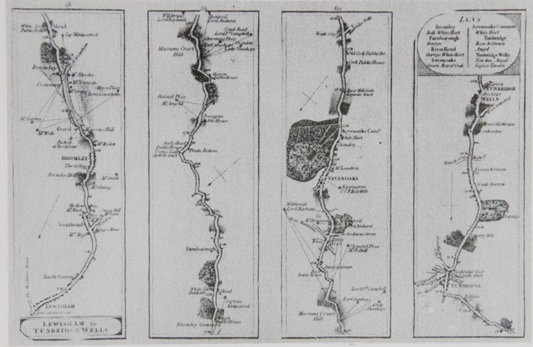 This is an engraving of the original route between Lewisham and Tenterden, although of rather poor quality reproduction. North is at the bottom, and the route is described working south from left to right across the four panels. Farnborough is in the second panel.