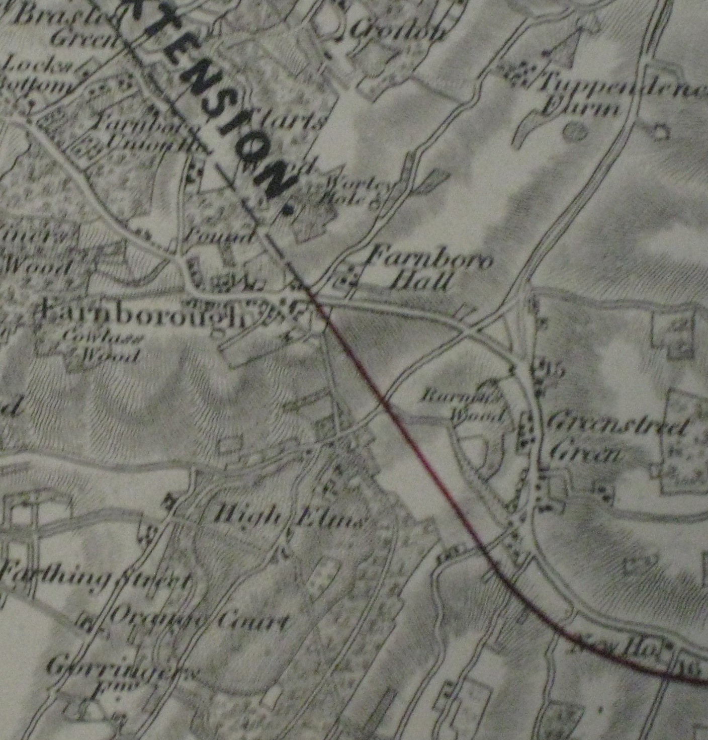 The detailed map above, also this diagram, show the planned location of the Farnborough terminus. This was proposed to be adjacent to the junction between Tubbenden Lane and the High Street. |