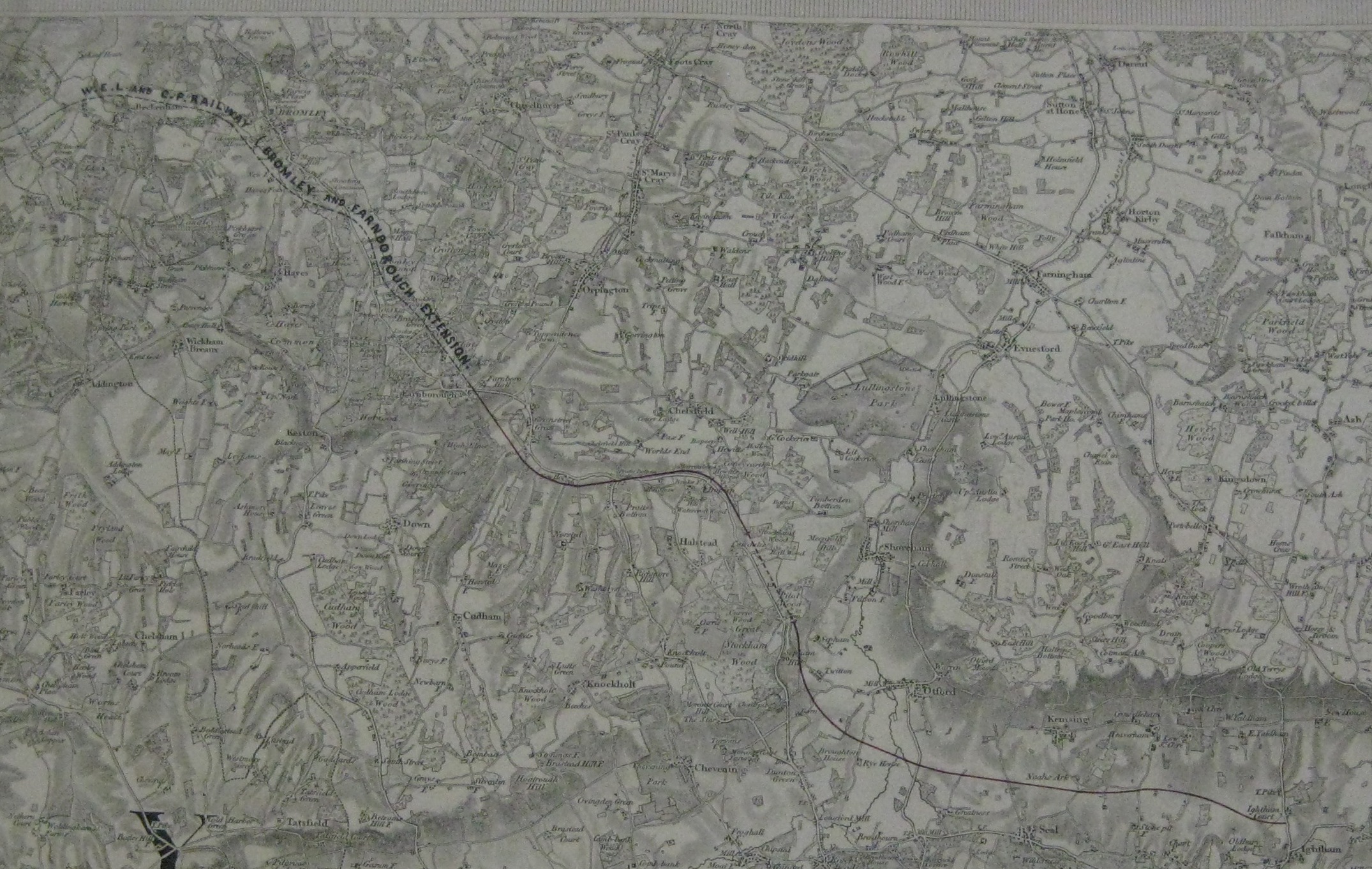 There was also a second Act, approved in 1856, authorising a further extension from Farnborough down to Ightham in Kent. The initial submission was in 1854 under the name 'London and Mid Kent', but it was then resubmitted in 1856 as an extension of the West End of London and Crystal Palace Railway'.The route is shown in the map below, with a second diagram, that shows more clearly the route to be taken through the village. The old George and Dragon Inn is clearly shown, as is a proposed minor diversion of Tubbenden Lane.