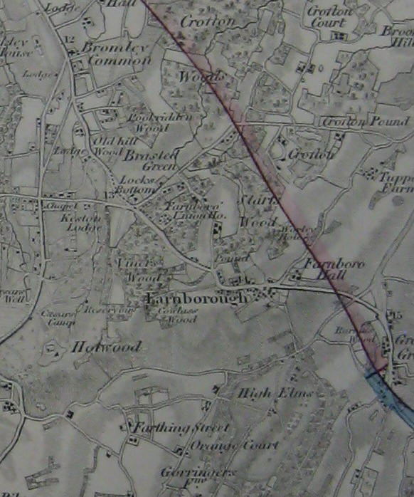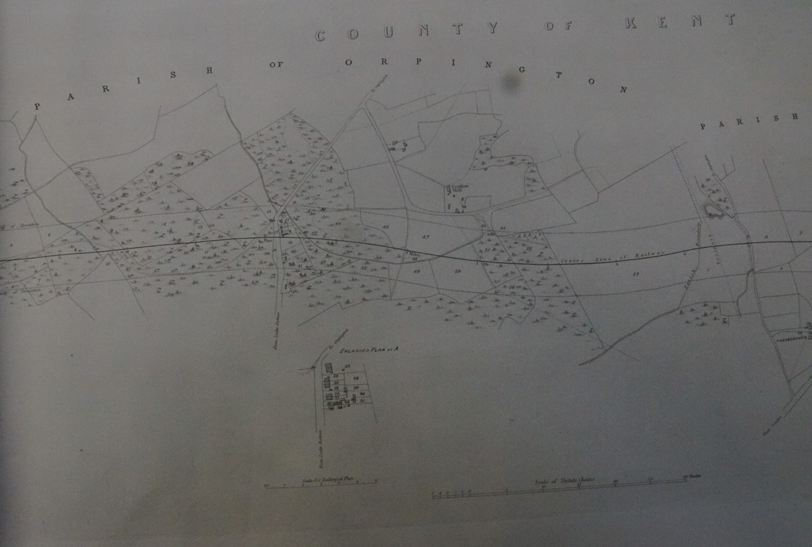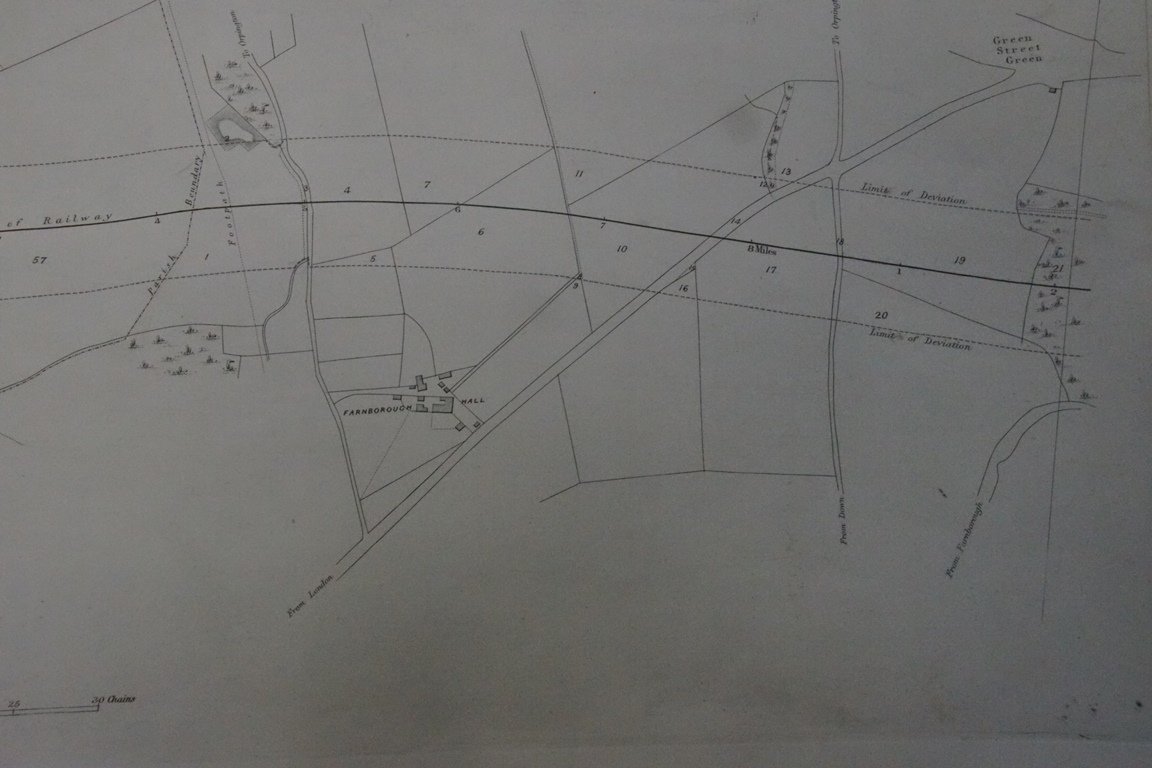 Only the first two of these involve Farnborough. The narrative describes a railway commencing by a junction with the London Brighton and South Coast Railway near Sydenham station and proceeding to a point adjacent to the turnpike road at Green Street Green, then continuing in the second section to terminate in 'a field within a short distance from and to the southward side of Twitton Farmhouse in the parish of Otford, and to the eastward of the road from Dunton Green to Otford, all in the said county of Kent'.