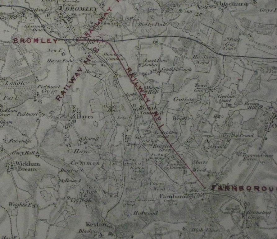 This short railway was to run as a branch from the new Shortlands to St. Mary Cray section of the main line, which was then under construction. It would run from a junction just beyond Bromley (South) station to Farnborough, terminating as with many of the other proposals, by the junction between the High Street and Tubbenden Lane.