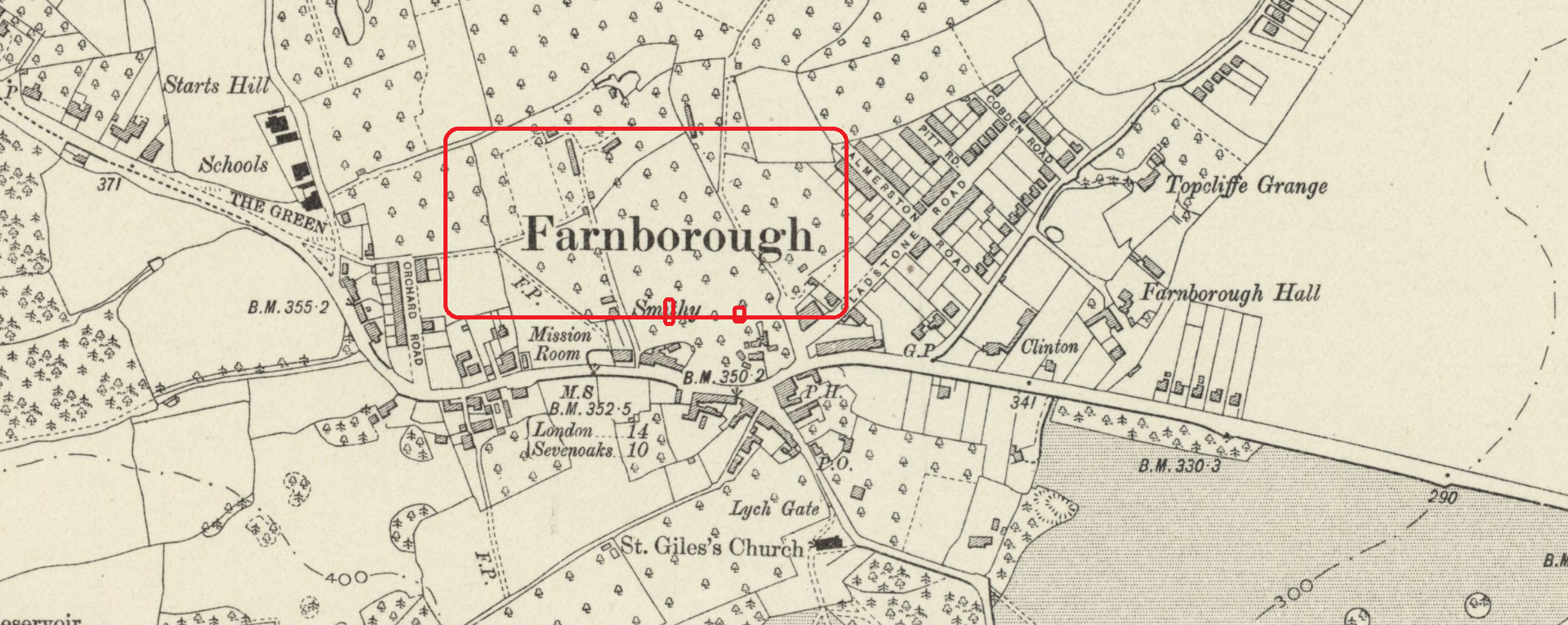 Mr. Thomas Hubbard acquired part of the pastureland of the Farnborough Hall Estate from Sir Percival Hart Dyke in 1899 for building purposes. Hubbard was a patriotic man and named the roads after parliamentary statesmen.Farnborough had no significant local industry for residential expansion except Fox's Brewery at Green Street Green, but a railway connection was planned through Farnborough which prompted Hubbard's development. This was indeed the Bromley and District Light Railway.