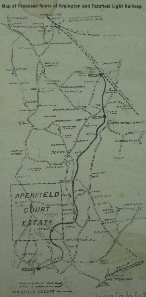 The Tatsfield Light Railway, and its later revival as the Southern Heights Light Railway, were the only proposals to involve a branch off the new Southeastern main line through Orpington. Its purpose was to support the opening up of the then very rural area surrounding Biggin Hill to development.