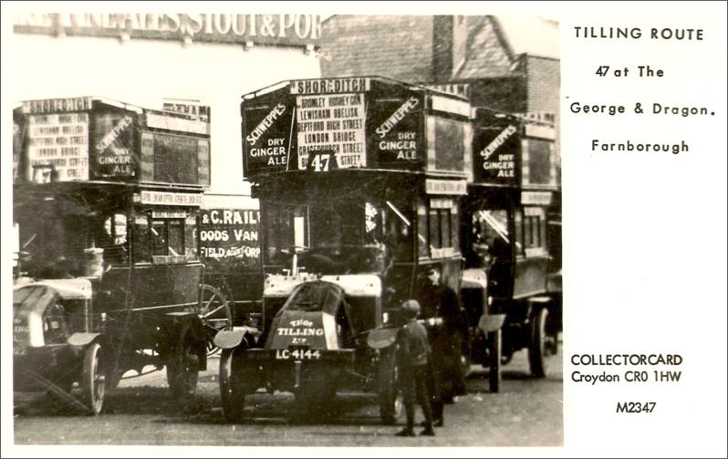 Thomas Tilling Ltd’s motor buses started operation on route 47 between Shoreditch and Bromley on 20 July 1912, replacing a horse bus route from ‘The City’ to Lewisham. Joint working with the London General Omnibus Company, London’s principal bus operator, began in 1908, and came to route 47, by then extended south to Farnborough in 1913.
