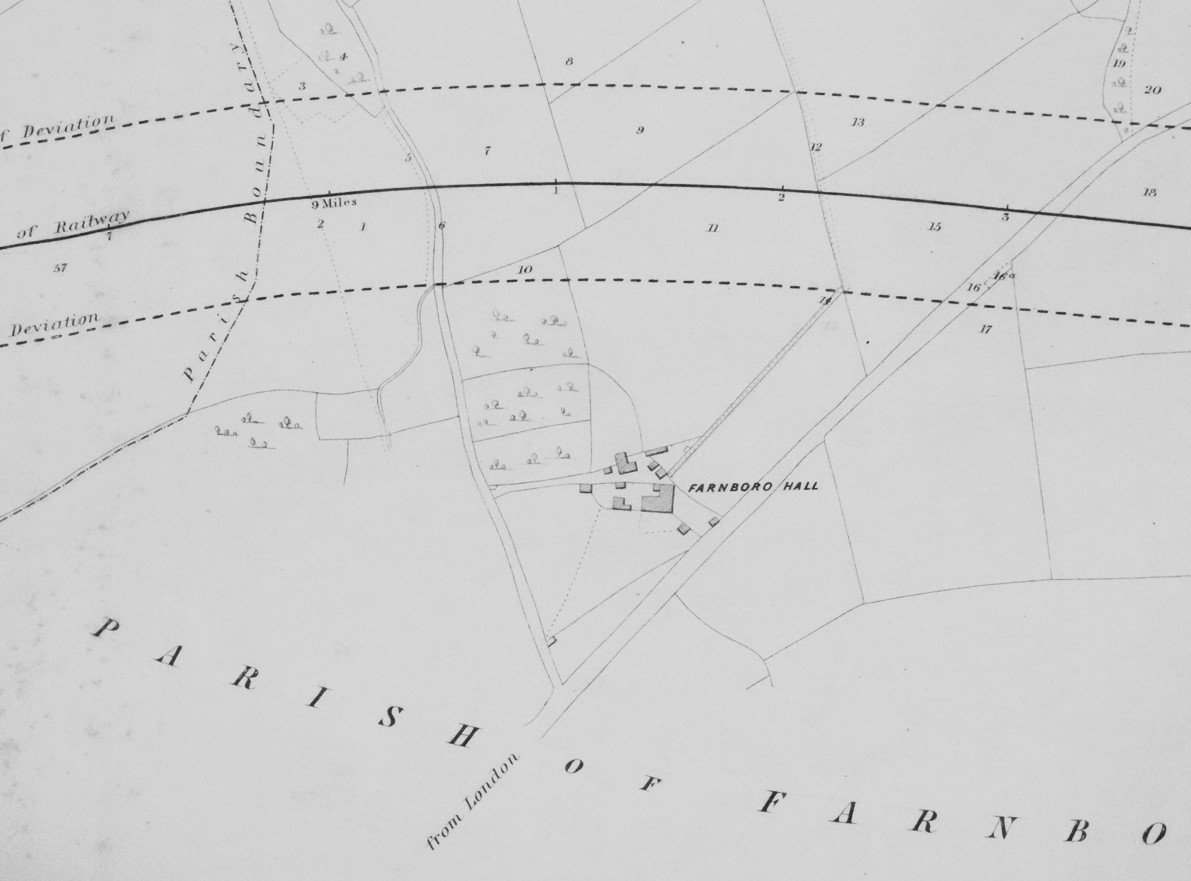 Come the railway age, and a railway connection to London would have been expected to follow, but this did not happen.  There were some fourteen proposals, but none succeeded. Instead two main lines were eventually routed through Bromley and Orpington, at the nearest about one mile away.  Had the railway come to Farnborough then the development of the village would surely have been very different.