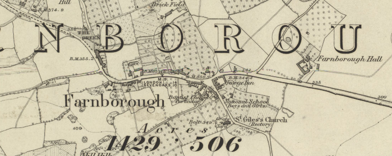 Farnborough is 13.4 miles from London (Charing Cross), about 10 from Sevenoaks, and 350 feet above sea level. Evidence dating from when it was a significant point on the turnpike road can still be seen today.