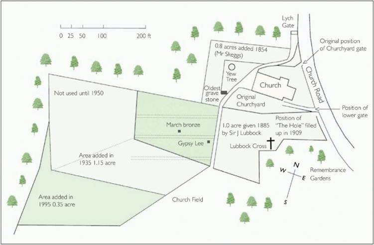 The lowering of the road led to the resiting of the two entrances to St. Giles churchyard. The original positions are indicated by two arrows pointing toward Church Road in the diagram above. Note that the main part of the churchyard did not exist at this time. It was added in phases as new land was acquired from the end of the nineteenth century.