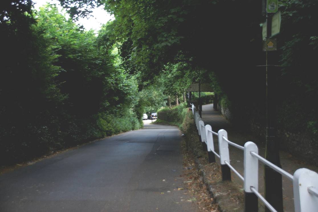 The photo on the right above is from the beginning of the last century, and shows how the road sinks down below the old ground level. It is not easily possible to recreate this view today because of the growth in trees and other vegetation, and the erection of new fencing.